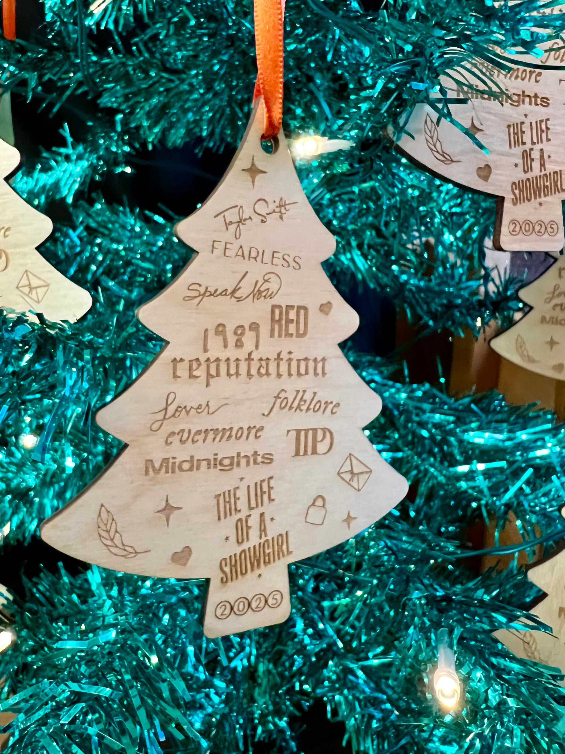 Tree shaped laser engraved with all the albums on birch wood. 5 in high. Comes with orange ribbon. Making small batches for limited time. Super cute addition to every Christmas tree this year or added decor.
